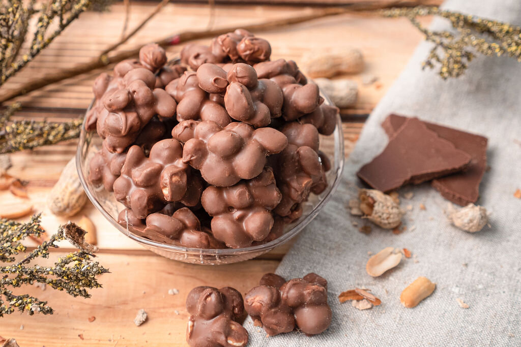 Jumbo peanuts coated in milk chocolate.